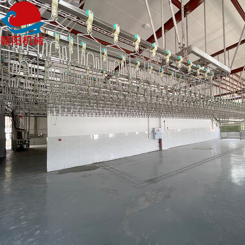1)雞宰殺高架輸送線主要完成的工序:毛雞上掛、水浴式麻電、刺殺、瀝血、燙毛、脫毛、切爪、轉(zhuǎn)掛等。