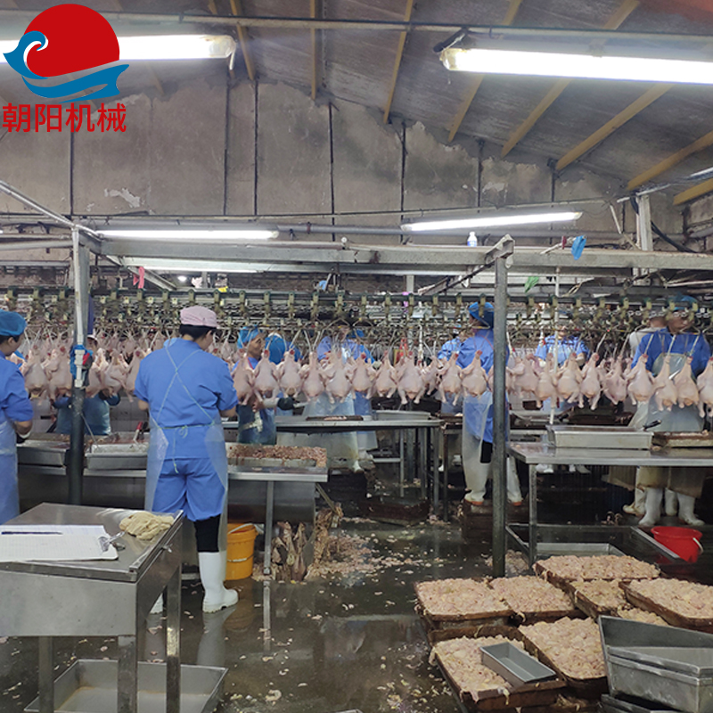 注:產(chǎn)品不同,工藝流程有差距。諸城市朝陽機(jī)械有限公司是一家集家禽屠宰設(shè)備、家禽屠宰流水線研發(fā)生產(chǎn)和設(shè)計銷售于一體的生產(chǎn)制造商。公司具有較完善的設(shè)計、研發(fā)、檢測和售后體系,并且具有雄厚的技術(shù)力量,進(jìn)步的工藝設(shè)計水平、屠宰設(shè)備和安裝水平,是國內(nèi)家禽屠宰機(jī)械行業(yè)代表性企業(yè)。公司長期與國內(nèi)外屠宰加工企業(yè)合作,走引進(jìn)——消化——創(chuàng)新和自主研發(fā)相結(jié)合的道路,在國內(nèi)外同類產(chǎn)品的基礎(chǔ)上,不斷更新和改造。公司主要設(shè)備有:A字型立式脫毛機(jī)、臥式脫毛機(jī)、強(qiáng)力噴淋機(jī)、松毛機(jī)、浸燙池、螺旋預(yù)冷機(jī)、禽籠清洗機(jī)、電暈機(jī)、兔扯皮機(jī)、兔割前爪/后爪機(jī)、剝胗機(jī)、自動洗鉤機(jī)、螺旋燙爪機(jī)、雞爪脫皮機(jī)、分割輸送帶等屠宰用設(shè)備。其中,公司獨(dú)力發(fā)明生產(chǎn)設(shè)計的“電動調(diào)節(jié)脫毛機(jī)”及“自動控水控溫浸燙池”順利通過知識產(chǎn)權(quán)局的實(shí)質(zhì)性審查。公司所生產(chǎn)的設(shè)備性能達(dá)到國際同類產(chǎn)品水平,處于國內(nèi)超前地位,可與國外同類產(chǎn)品配套使用,設(shè)備遠(yuǎn)銷阿爾及利亞、澳大利亞等中東、非州等并建立了長期穩(wěn)定的合作關(guān)系。