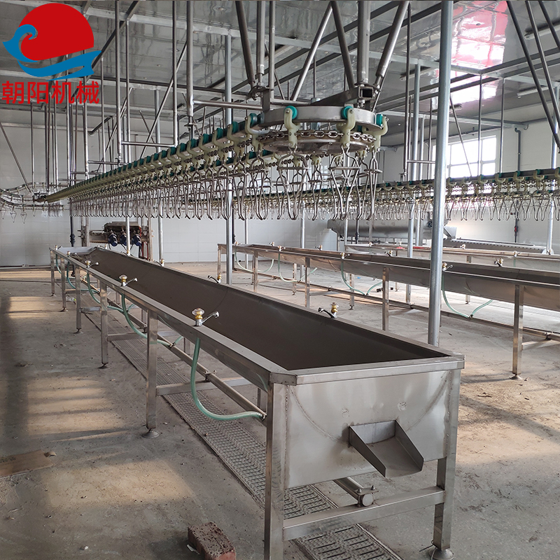雞宰殺之前,需要人工掛雞,然后用90v電麻機把雞電麻之后人工宰殺,瀝血,瀝血時間4-5分鐘,瀝血完成之后進入浸燙池浸燙2分鐘左右,浸燙溫度在58-61攝氏度,浸燙溫度可以根據雞的生長周期來調整溫度,浸燙池的尺寸是根據客戶的宰殺量來定制。
